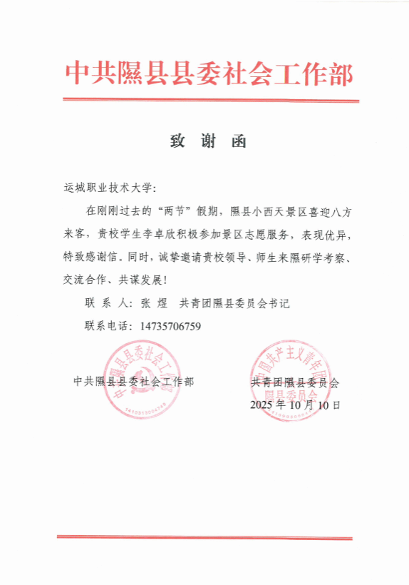 近日,中共隰县县委社会工作部、共青团隰县委员会向我校发来感谢信,对我校信创学院网络工程技术(本科)2509班李卓欣同学在“两节”期间主动放弃休假、投身家乡小西天景区志愿服务的突出表现给予高度评价。面对假期客流高峰,李卓欣同学坚守秩序维护、应急救助、咨询引导等岗位,以真诚奉献展现了新时代青年的责任担当,为提升游客体验、助力地方发展贡献了青春力量。